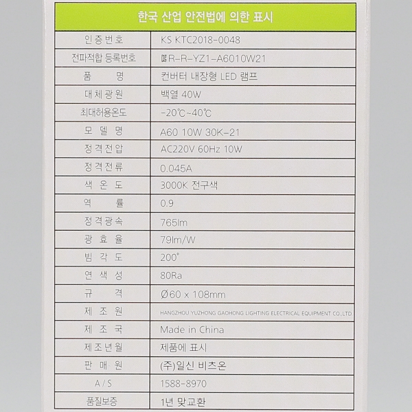 | ǰ¸í ¹× ¸ðµ¨¸í | LED ¹úºê/10W Àü±¸ KS A60 |