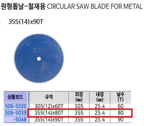 ¸ðµ¨¸í ¹× ±Ô°Ý 355mm/80T-MT Ãâ°í´ÜÀ§ EA