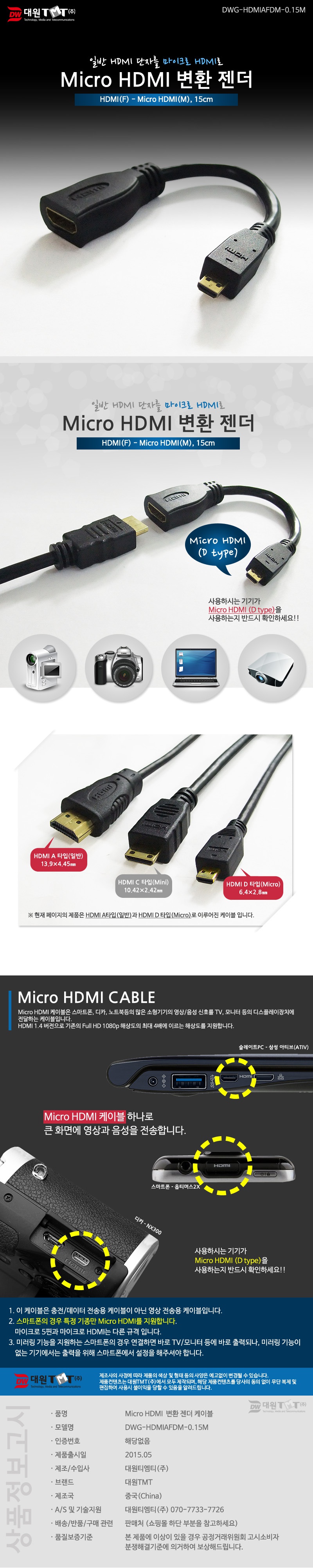 | ¸ðµ¨¸í | ´ë¿øTMT HDMI to Micro HDMI (F/M) Á¨´õ ÄÉÀ̺í 15cm DWG-HDMIAFDM-0.15M | ||