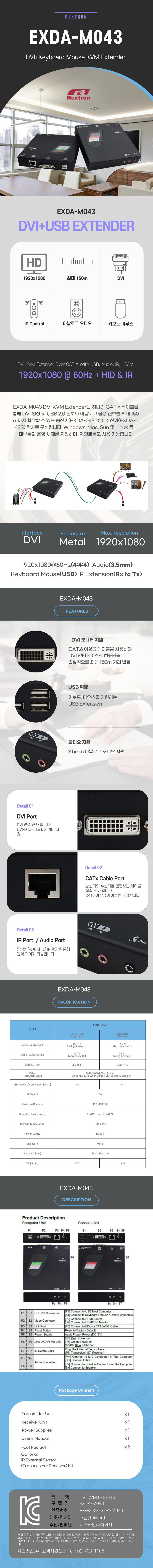 | ¸ðµ¨¸í | REXTRON EXDA-M043 DVI KVM ÀͽºÅÙ´õ ¸®ÇÇÅÍ over CAT6 UTP | ||